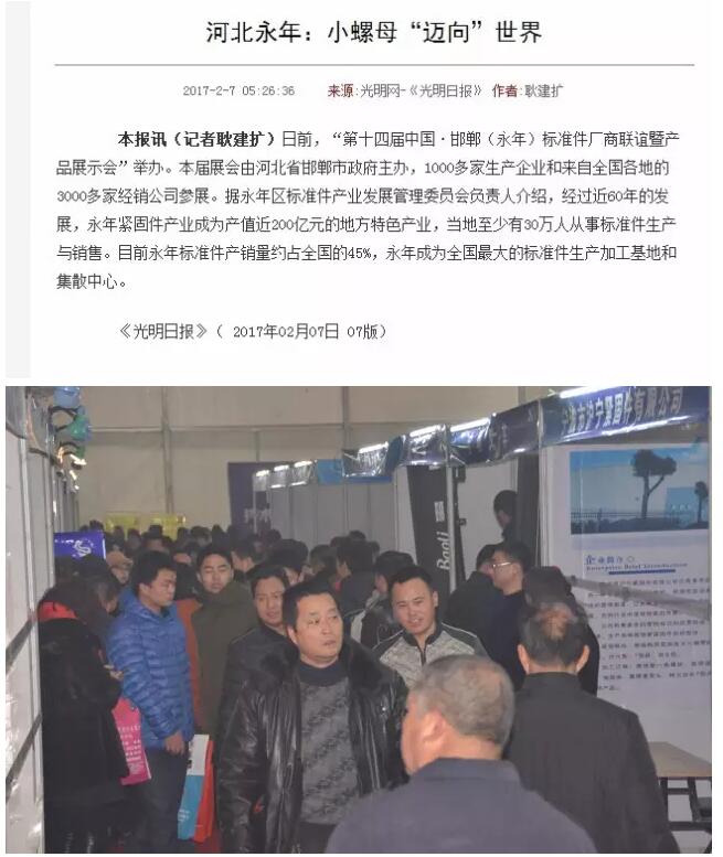 2017年2月4-5日,金江傳媒主辦的第十四屆中國永年標(biāo)準(zhǔn)件廠商聯(lián)誼暨產(chǎn)品展示會在中國國際標(biāo)準(zhǔn)件產(chǎn)業(yè)城物流廣場舉行。